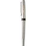 Exclusive Luxe design features intricate diamond etched pattern emblazoned on bottom barrel, with shiny chrome upper barrel to expertly frame company logos. Cap off design. Pen includes premium black ink cartridge